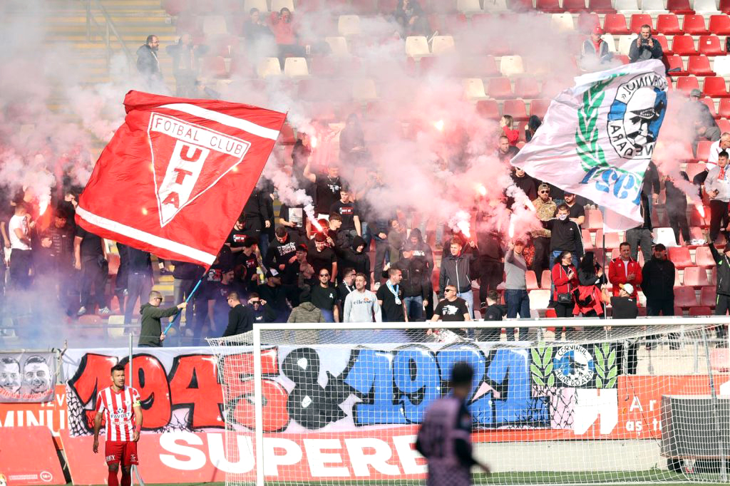 Într-o atmosferă caldă, al cărei fond sonor a fost asigurat de galeriile celor două echipe – care şi-au încurajat favoriţii împreună, de la peluza „Iosif Petschovschi” – ocupanta locului opt din Superligă şi liderul ligii secunde au oferit un joc cu ritm, plăcut ochiului. Prima şansă bună de gol a aparţinut echipei noastre, în debutul de joc, când şutul de la 20 de metri a lui Neacşa a fost respins în faţă de Gorcea, iar Hayatu a trimis peste, din câţiva metri, „jenat” de Stolnik. UTA a replicat din faze fixe, copiate „la indigo”: centrare din corner Alin Roman, „cap” Odada, de fiecare dată peste poartă. După fix jumătate de oră, corviniştii au avut o dublă ocazie: în urma unei lovituri de colţ, Ilie a finalizat în blocaj, după care mingea a ajuns la Cărăruş, care a tras puternic din careul mic, dar Stolnik a alunecat la sacrificiu şi a respins. Până la finalul primului act, gazdele au fost în postura de a replica şi au făcut-o prin Coman, care a primit o minge de la Roman în 16 metri, dar a plasat-o cu piciorul stâng de puţin pe lângă bara din dreapta lui Blaga.