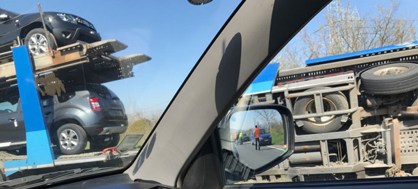 Un autotren care transporta autoturisme Dacia Duster pentru export s-a răsturnat ieri dimineaţă pe raza localităţii Veţel.
