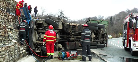Accidentul rutier grav a avut loc sâmbătă după amiază, pe raza comunei Băniţa, în zona serpentinelor de la Merişor. Şoferul TIR-ului venea dinspre Petroşani şi la coborâre pe serpentine nu a încetinit, iar într-o curbă periculoasă a pierdut controlul volanului. Mastodontul s-a răsturnat şi s-a izbit de parapeţii de pe marginea drumului, iar şoferul a rămas blocat în cabină. Acesta a suferit mai multe răni la mâini şi picioare, iar pentru a fi eliberat a avut nevoie de intervenţia echipelor de pompieri din cadrul Detaşamentului Petroşani. Echipajul ISU a reuşit să-i acorde primul ajutor şoferului rănit şi apoi să-l scoată din cabina autovehiculului, însă intervenţia a fost una dificilă.