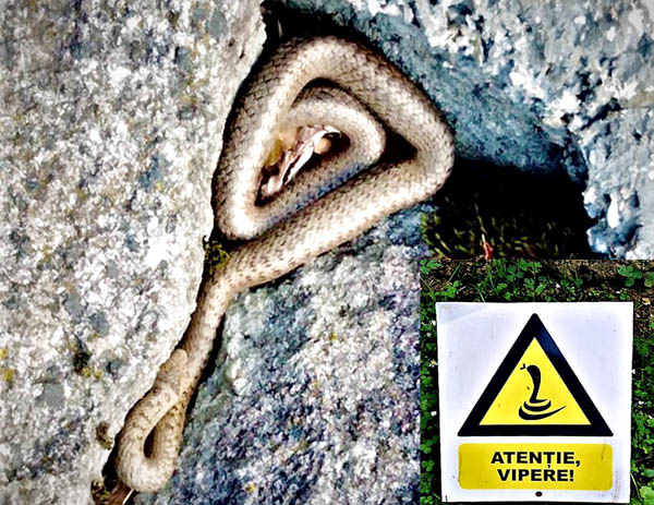 „Atenţie, nu umblaţi descălţaţi, nu vă aşezaţi pe iarbă, priviţi pe unde călcaţi, în apropierea pietrelor şi mai ales în Templul Mare de Calcar. La Sarmizegetusa, viperele nu se omoară”, a atenţionat Vladimir Brilinsky, administratorul sitului istoric. Viperele sunt întâlnite în mai multe zone turistice din judeţ, astfel că riscul accidentelor este ridicat, iar din acest motiv principalele spitale îşi asigură şi vaccinul antiviperin. Risc ridicat de accidente este şi în Defileul Jiului, mai ales că şerpii coboară de pe culmile munţilor în parcările amenajate, unde este răcoare. (M.Gânju)