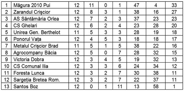 Cu titlul neoficial de campioană de toamnă a încheiat Măgura Pui, care a câştigat la „masa verde” duelul cu Santos Boz. „Lanterna roşie” a campionatului nu a fost programată de Asociaţia Judeţeană de Fotbal Hunedoara din cauza datoriilor financiare către aceasta, la următoarea neprogramare urmând să fie exclusă din campionat. În schimb, duelul dintre Unirea General Berthelot şi Metalul Crişcior ar putea fi reprogramat, oaspeţii neajungând la meci din cauza mijlocului de transport. O decizie în acest caz va fi luată azi, în şedinţa Comisiei de Disciplină a Asociaţiei Judeţene de Fotbal Hunedoara.