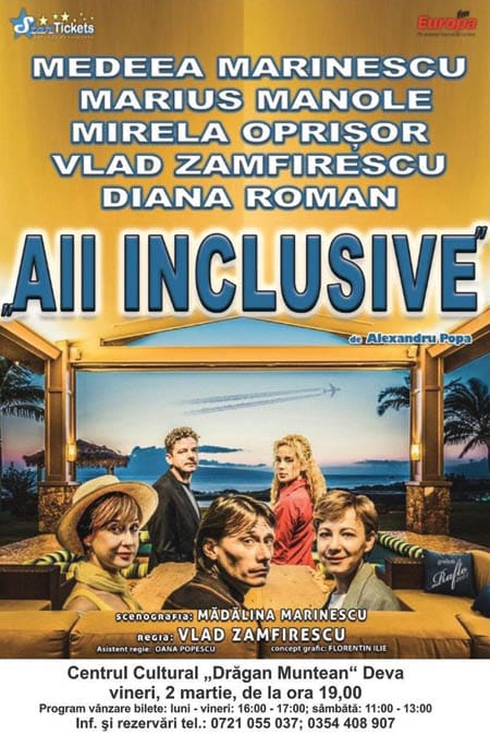 Vineri, 2 martie, de la ora 19, are loc spectacolul „All inclusive“, în sala mare a Centrului Cultural „Drăgan Muntean“ Deva. O comedie spumoasă, a cărei premieră s-a jucat cu casa închisă, este cea mai nouă producţie regizată de Vlad Zamfirescu şi este presărată cu situaţii de o ironie comică şi replici de tot hazul.