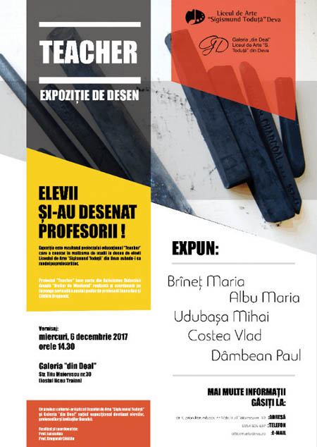 Liceul de Arte ”Sigismund Toduţă” din Deva vernisează mâine, la ora 14.30, expoziţia ”Teacher” la „Galeria din Deal”, spaţiu expoziţional destinat elevilor şi profesorilor liceului.