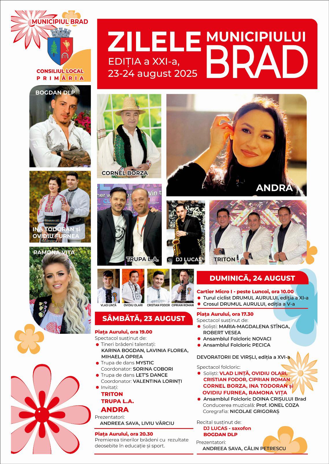 Municipiul Brad va fi în sărbătoare, administraţia locală organizând concerte, premiere a elevilor olimpici şi sportivilor cu performanţe, în cadrul Zilelor Municipiului Brad ce se vor desfășura în intervalul 23-24 august 2025.